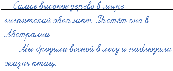 1. Самое высокое дерево в мире - гигантский эвкалипт. Растёт оно в Австралии. 2. Мы бродили весной в лесу и наблюдали жизнь птиц.
