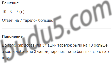 5. На столе тарелок на 10 больше, чем чашек. На сколько больше станет тарелок, чем чашек, если на стол поставят еще 3 чашки. На