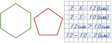 Сравни многоугольники и длины их сторон. Догадайся, на сколько сантиметров периметр шестиугольника будет больше, чем периметр пятиугольника, и запиши ответ: на