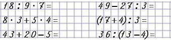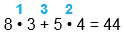 | 8 • 3 + 5 • 4 = 24 + 20 = 44 | (17 + 4) : 3 = 21 : 3 = 7 |