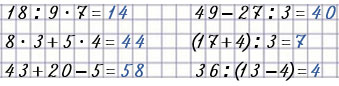 | 18 : 9 • 7 = 2 • 7 = 14 | 49 - 27 : 3 = 49 - 9 = 40 |
