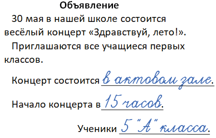 Задание 7. Умеешь ли ты писать записки, приглашения, объявления? Прочитай объявление. Допиши его.