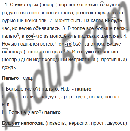 1. С (не)которых пор летают какие(то) мушки радует глаз (ярко)зелёная трава розовеют (красновато)бурые шишечки ели. 2. Может быть, на какой(нибудь) час но весна объявилась. 3. В толпе всё больше лёгких пальто3, а (кое)кто из молодёжи в пиджаках щеголяет. 4. Ночью поднялся ветер. Чем(то) бьёт за окном. Бушует (не)погода.4 5. И вот уже (не)сколько дней идёт холодный (не)приятный дождь.