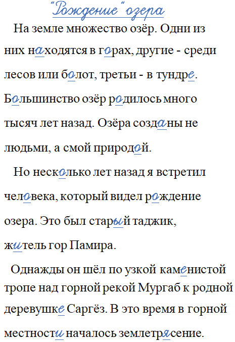На земле множество озёр. Одни из них н_ходятся в г_рах, другие - среди лесов или б_лот, третьи - в тундр_. Б_льшинство озёр р_дилось много тысяч лет назад. Озёра созд_ны не людьми, а смой природ_й.