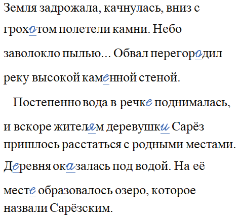 Постепенно вода в речк_ поднималась, и вскоре жител_м деревушк_ Сарёз пришлось расстаться с родными местами. Д_ревня ок_залась под водой. На её мест_ образовалось озеро, которое назвали Сарёзским.