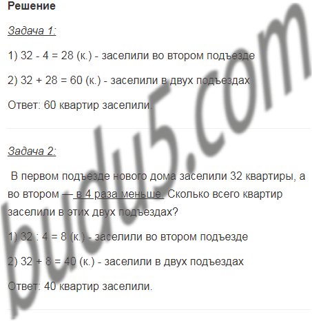 21. В первом подъезде нового дома заселили 32 квартиры, а во втором — на 4 квартиры меньше. Сколько всего квартир заселили в этих двух подъездах?