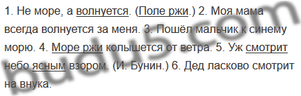 1. Не море, а волнуется. (Поле ржи.) 2. Моя мама всегда волнуется за меня. 3. Пошёл мальчик к синему морю. 4. Море ржи колышется от ветра. 5. Уж смотрит небо ясным взором. (И. Бунин.) 6. Дед ласково смотрит на внука.