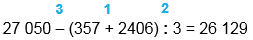27 050 - (357 + 2406) : 3 = 26 129