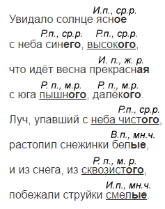 - Укажите падеж и род у имён прилагательных в единственном числе и падеж у имён прилагательных во множественном числе.