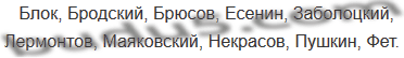 Пушкин, Лермонтов, Фет, Некрасов, Блок, Брюсов, Маяковский, Есенин, Заболоцкий, Бродский.