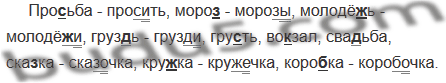 Про..ьба, моро.., молодёжь, груз..ь, гру..ть, во..зал, сва..ьба, ска..ка, кру..ка, коро..ка.