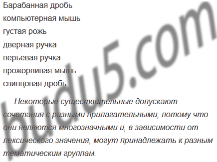 Объедините прилагательные из левого столбца и существительные из правого в словосочетания. Объясните, почему некоторые существительные допускают сочетания с разными прилагательными. В ответе используйте термины «многозначное слово» и «тематическая группа».