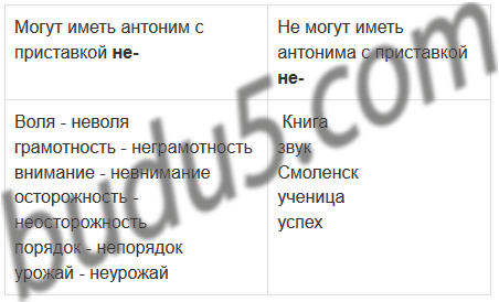 | Могут иметь антоним с приставкой не- | Не могут иметь антонима с приставкой не- |