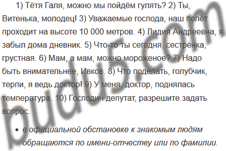 1) Тётя Галя можно мы пойдём гулять? 2) Ты Витенька молодец! 3) Уважаемые господа наш полёт проходит на высоте 10 000 метров. 4) Лидия Андреевна я забыл дома дневник. 5) Что-то ты сегодня сестрёнка грустная. 6) Мам, а мам можно мороженое? 7) Надо быть внимательнее Ивков. 8) Что поделать голубчик терпи, я ведь доктор! 9) У меня доктор поднялась температура. 10) Господин депутат разрешите задать вопрос.