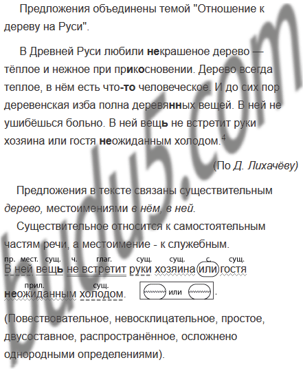 В ней не ушибёшься больно. В Древней Руси любили (не)крашеное дерево — тёплое и нежное при пр..к..сновении. Дерево всегда теплое, в нём есть что(то) человеческое. В ней вещ(?) не встретит руки хозяина или гостя (не)ожиданным холодом.4 И до сих пор деревенская изба полна деревя(н, нн)ых вещей.