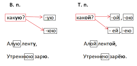 Имена прилагательные женского рода в винительном падеже отвечают на вопрос какую? и имеют окончания -ую, -юю.