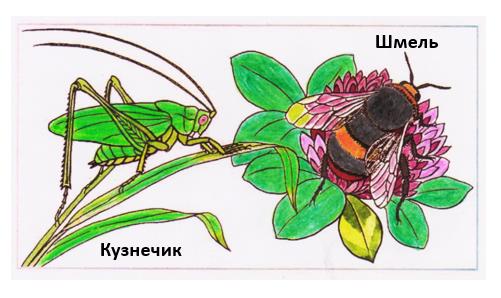 1. Здесь нарисованы кузнечик и шмель. Кузнечик весь зелёный, он маскируется под цвет зелёной травы. Шмель ярко-жёлтый с чёрными полосками. Яркий окрас тела защищает шмеля от врагов, сигнализирует для них опасность.