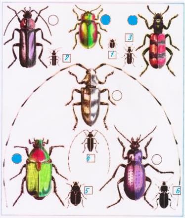 На цветных рисунках жуки увеличены. На самом деле их размеры такие, как на маленьких чёрных рисунках. Постарайся представить себе каждого жука такого размера, какой он на самом деле.