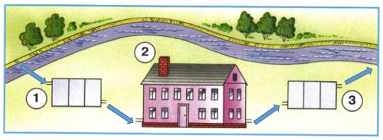 3. Очистные сооружения. Загрязнённая вода от жилых домов поступает на очистные сооружения, где проходит очистку и сливается в реку.