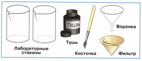 Оборудование: лабораторные стаканы, тушь любого цвета, кисточка, воронка и фильтр.