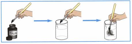 Берём для опыта прозрачный стакан, набираем в него воду из крана. Затем возьмём кисточкой немного чёрной туши и размешаем.