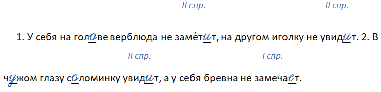 1. У себя на гол_ве верблюда не заме́т_т, на другом иголку не увид_т. 2. В ч_жом глазу с_ломинку увид_т, а у себя бревна не замеча_т.