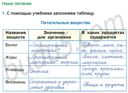 1. С помощью учебника заполни таблицу "Питательные вещества".