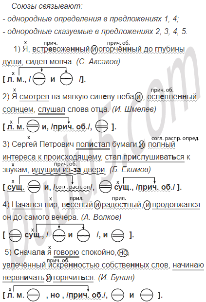1) Я встр..воже(н, нн)ый и огорчё(н, нн)ый до глубины души сидел молча. (С. Аксаков) 2) Я смотрел на мягкую син..ву неба и осл..плё(н, нн)ый солнцем слушал слова отца. (И. Шмелев) 3) Сергей Петрович пол..стал бумаги и полный интереса к происходящему стал пр..слушиват(?)ся к звукам идущим из(за) двери. (Б. Екимов) 4) Начался пир в..сёлый и радос(?)ный и продолжался он до самого вечера. (А. Волков) 5) (С)начал.. я говорю спокойно но увлечённый искре(н, нн)остью собстве(н, нн)ых слов начинаю нервн..чать и горячит(?)ся. (И. Бунин)