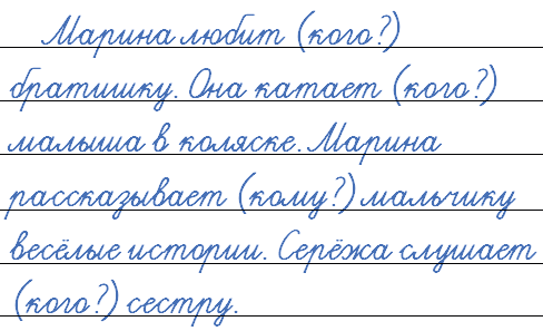 Марина любит (...) братишку. Она катает (...) малыша в коляске. Марина рассказывает (...) мальчику весёлые истории. Серёжа слушает (...) сестру.