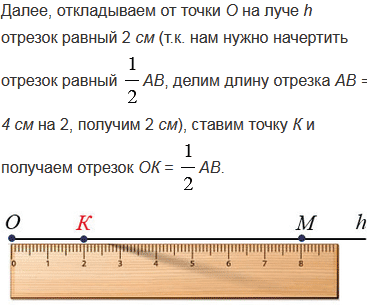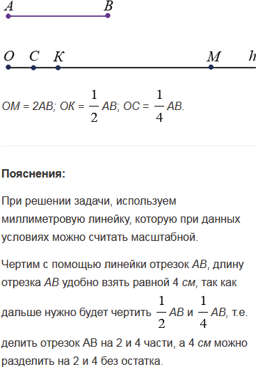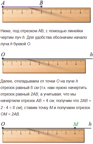 Начертите отрезок АВ и луч h. Пользуясь масштабной линейкой, отложите на луче h от его начала отрезки, длины которых равны 2АВ,