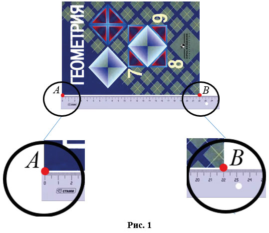 То есть один из концов учебника должен совпадать с нулевым делением на линейке - точка А, а другой конец учебника совпадет с делением - точка В, которое укажет его длину, т.е. длина учебника на Рис.1 АВ = 22 см или АВ = 220 мм (в вашем случае, значение длины может быть другим, все зависит от того, в каком году был издан учебник).