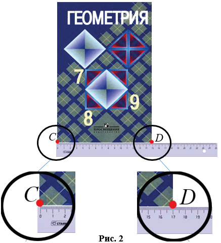 То есть один из концов учебника должен совпадать с нулевым делением на линейке - точка С, а другой конец учебника совпадет с делением - точка D, которое укажет его ширину, т.е. ширина учебника на Рис.2 СD = 17 см или СD = 170 мм (в вашем случае, значение ширины может быть другим, все зависит от того, в каком году был издан учебник).