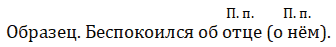 Беспокоился об отце (о нём), поверил в победу (в неё), увидел салют (его), любовался пейзажем (им), сделал из металла (из него), извинился перед товарищем (перед ним), спросил у директора (у него), подъехал к вокзалу (к нему), доверил ученице (ей), мечтал о путешествиях (о них), дружил с космонавтом (с ним).