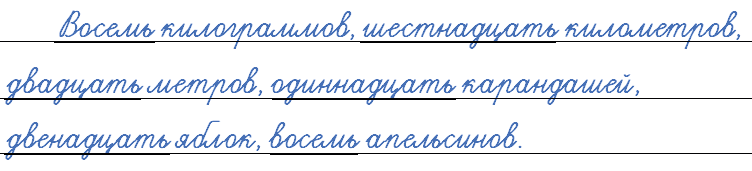 Восемь килограммов, шестнадцать километров, двадцать метров, одиннадцать карандашей, двенадцать яблок, восемь апельсинов.