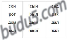 Сон, сын, сад, рот, рыл, рак, дом, дым, дал, вол, выл, вал.
