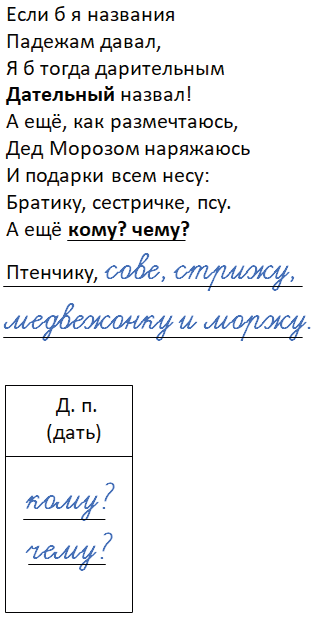 Подставляя существительные в дательном падеже, помни о правильных окончаниях.
