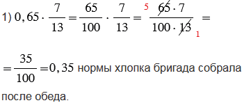 До обеда бригада собрала 0,65 нормы хлопка, а после обеда - 0,35 нормы хлопка, значит, всего за день бригада собрала: