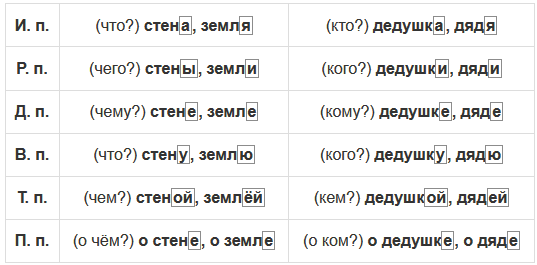 | Т. п. | (чем?) стеной, землёй | (кем?) дедушкой, дядей |
