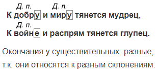 Окончания у имён существительных в дательном падеже разные, поскольку существительные разного склонения.