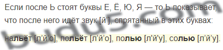 Ь не только показывает мягкость согласного звука ПЕРЕД ним! Если ПОСЛЕ него стоят буквы Е, Ё, Ю, Я — Ь показывает, что ПОСЛЕ него идёт звук [й’], спрятанный в этих буквах.