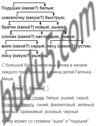 Ты узнал, из каких стихотворений взяты эти строчки? Прочитай слова, которые называют цвет. Какие ещё слова ты мог бы добавить? В первом предложении автор играет словами. Ты заметил какими? Прочитай.