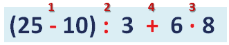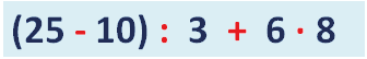(25 - 10) : 3 + 6 • 8 = 15 : 3 + 6 • 8 = 5 + 6 • 8 = 5 + 48 = 53