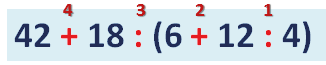 42 + 18 : (6 + 12 : 4) = 42 + 18 : (6 + 3) = 42 + 18 : 9 = 42 + 2 = 44